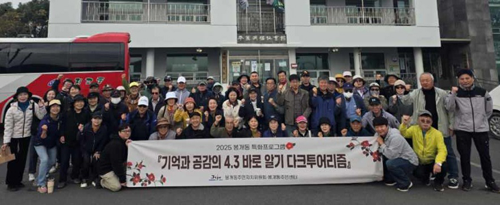 제주시 봉개동 주민자치위원회(위원장 고영섭)는 지난 2일 주민 80여 명이 참여한 가운데 특화프로그램 '기억과 공감의 4·3 바로알기 다크투어리즘'을 진행했다.