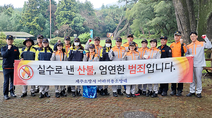 제주소방서 아라119센터(센터장 문원철) 아라남·여성의용소방대(대장 양창용·백행자)는 지난 9일 산천단 일대에서 산불예방 캠페인과 자연정화 활동을 벌였다.