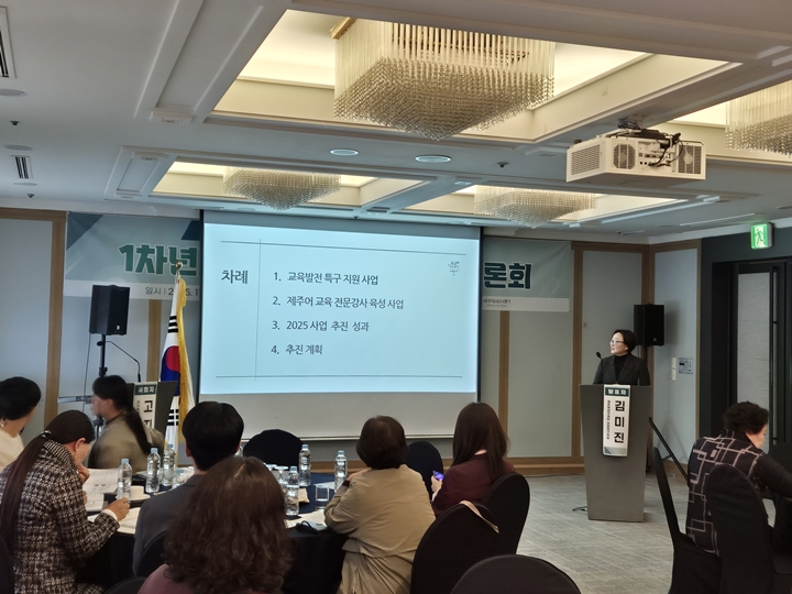 제주학연구센터는 7일 오후 메종글래드 제주에서 '2025 제주어 교육발전특구 지원 사업 추진 실적 공유 및 토론회'를 열고 전문강사 양성 체계 구축과 교육과정 ·교재 개발 등 1차년도 성과를 발표했다. 이번 사업은 교육부 교육발전특구 국비 지원으로 올해 처음 추진됐다.