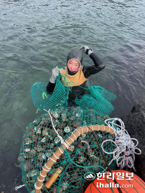 물질을 마친 신민희 해녀의 망사리에 바다에서 갓 잡은 해산물이 그득 들어 있다. 신민희 씨 제공