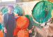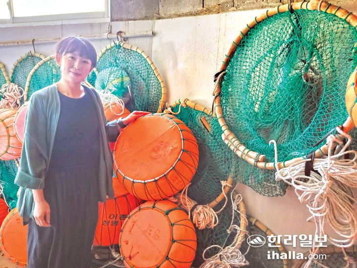 지난 7일 신민희 해녀가 작업장 한편에 보관된 테왁 망사리 옆에서 포즈를 취했다. 진선희기자