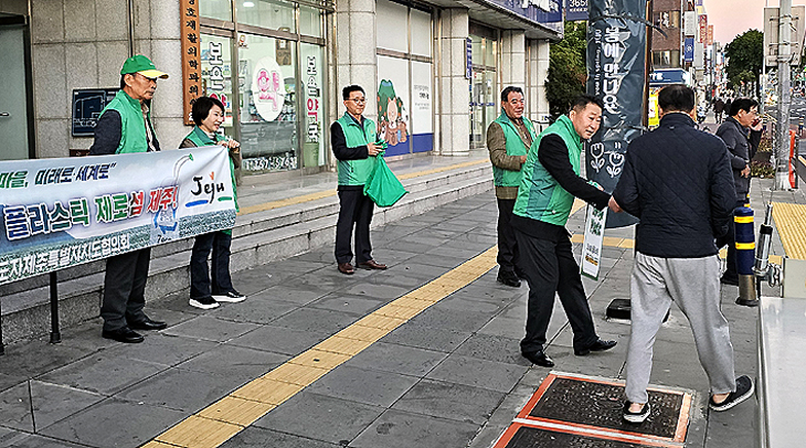 새마을지도자제주특별자치도협의회(회장 변봉남)는 지난 10일 시협의회장 및 운영위원 등 10명이 참석한 가운데 제주시터미널 입구에서 2040년까지 플라스틱 없는 지속가능한 자원순환체계를 구축하는 '2040 플라스틱 제로 제주' 홍보 캠페인을 전개했다.