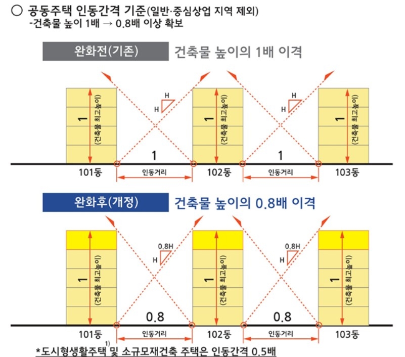 또 개정안은 공동주택 채광 확보 기준도 완화해 채광창이 있는 벽면 높이를 인접 대지와의 이격거리 2배에서 3배까지 허용하고 있다.