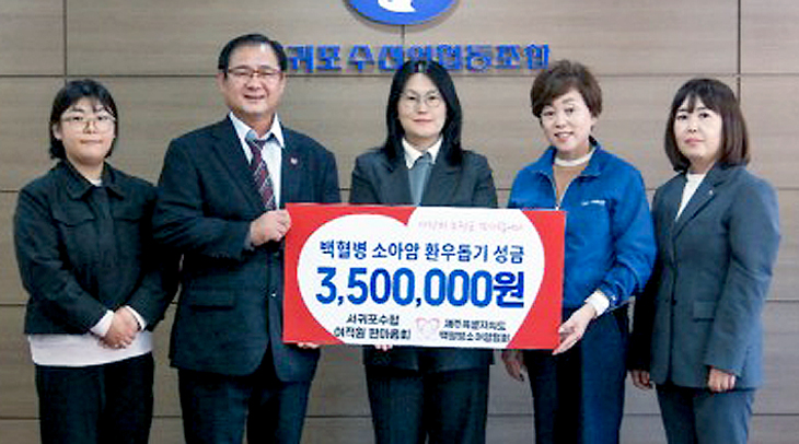 서귀포수산업협동조합(조합장 김미자) 소속 한마음 여직원회는 지난 13일 '제주바당 신선한 수산물 슛~ 할인전' 행사를 통해 마련한 백혈병·소아암 환우 지원 성금 350만원을 기탁했다.