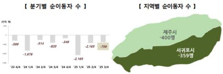 이와 함께 청년층 중심의 인구 순유출이 계속되며 지역 경제의 활력 저하 우려를 키우는 요인으로 작용하고 있다. 3분기 제주지역 순이동자 수 전입보다 전출이 많은 -759명으로, 9분기 연속 순유출 흐름이다. 연령대별로는 특히 20대(-512명)와 10대(-244명)에서 순유출 규모가 컸다. 지역별로는 제주시(-400명)와 서귀포시(-359명) 모두 인구가 빠져나간 것으로 나타났다.
