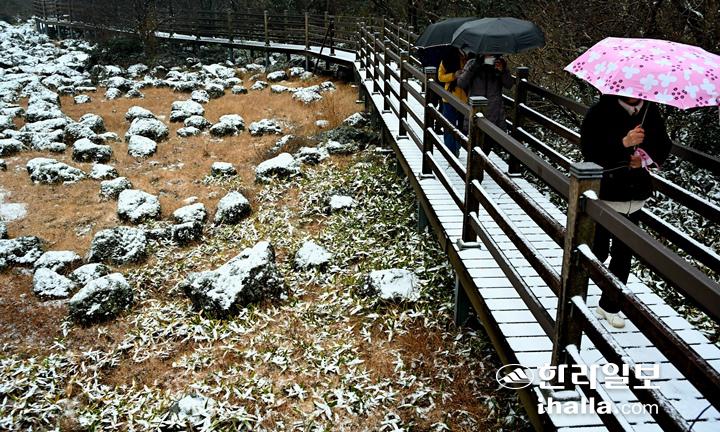 [한라일보] 찬 대륙고기압 영향으로 서해 상에서 만들어진 비구름대가 제주지방으로 유입되면서 18일 한라산 1100고지 습지에 첫눈이 내렸다. 지난해에는 11월26일 밤에 한라산 첫눈이 관측됐다. 제주기상청은 오는 20일까지 한라산 높은 산지를 중심으로 1~5㎝의 눈이 내려 쌓이겠다고 예보횄다. 강희만 기자