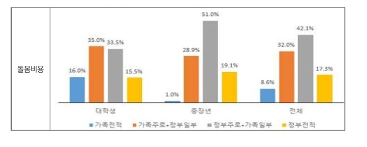 이에 따르면 돌봄에 대한 책임이 어디에 있는가에 대한 인식은 노인·아동 등 대상자에 따라, 양육이냐 부양이냐에 따라 세대 간 다르게 나타났다. 큰 틀에서 도내 대학생과 중장년 모두 가족을 중심으로 정부나 외부 지원이 이뤄지는 돌봄 정책을 선호하고 있으나 대학생은 대체로 가족과 개인의 책임을 더 강조하는 반면 중장년은 제도적 관점에서 정부의 지원이 더 필요하다고 했다.