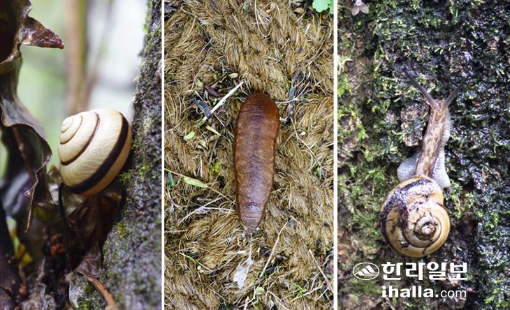 사진 왼쪽부터 내장산띠달팽이, 민달팽이, 충무띠달팽이