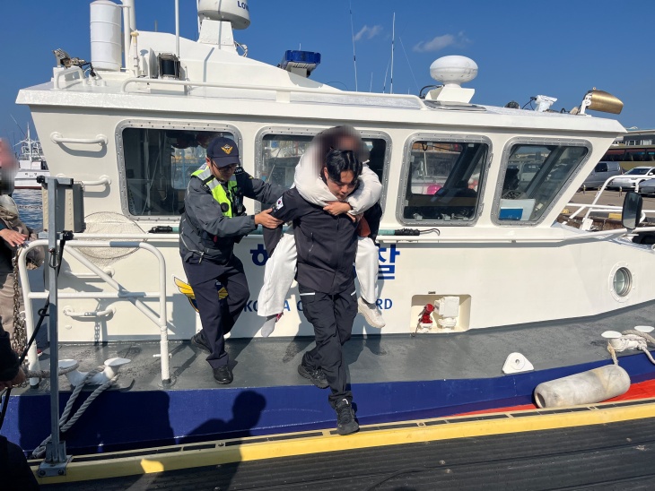 제주해경이 비양도에서 발목 부상을 입은 관광객을 연안구조정으로 긴급 이송하고 있다. 제주해양경찰서 제공
