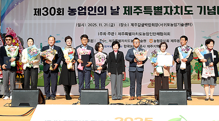 제주도는 이날 제주 농업 발전에 공로가 큰 6명의 농업인에게 '제주특별자치도 농업인상'을 수여했다. 이와 함께 중앙 단위 포상 10점, 우수농업인 23점, 감사패 5점 등도 전수됐다.