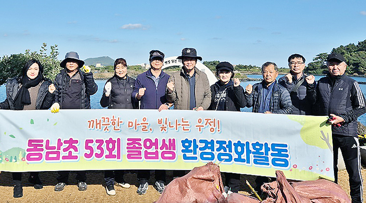 동남초등학교 53회 졸업생 10여 명은 지난 22일 '깨끗한 마을, 빛나는 우정'이라는 슬로건 아래 고향 마을의 자연환경 보전을 위한 환경 정화 활동으로 연안 습지 보호 지역 일대에서 각종 쓰레기를 수거했다.