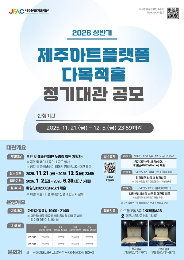 제주시 원도심 (구)아카데미극장 5층에 위치한 제주아트플랫폼 다목적홀은 공연과 세미나 등 다양한 소규모 문화예술 행사를 진행할 수 있는 공간이다. 대관 신청은 문화예술 관련 행사를 기획·운영하는 도민 및 예술인을 대상으로 하며, 신청자는 재단 누리집 회원가입 후 정기대관 신청서를 지정 접수처 이메일(yjk0203@jfac.kr)로 제출하면 된다. 신청서 양식은 웹포스터 내 QR코드 또는 재단 누리집 공지사항에서 내려받을 수 있다.
