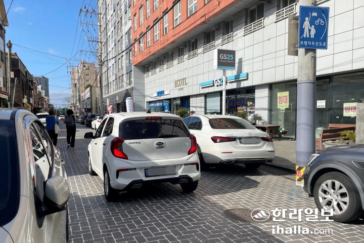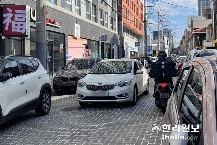 26일 오전 제주시 신광로4길 보행자 우선도로. 주차된 차량과 통행하는 차량들로 보행자가 다니기 불편한 모습이다. 양유리기자
