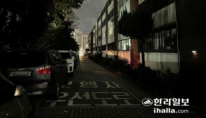 지난 17일 오후 제주시 제원2길 보행자 우선도로. 도로에 가로등이 설치되지 않아 어두워 통행이 불편하다. 양유리기자