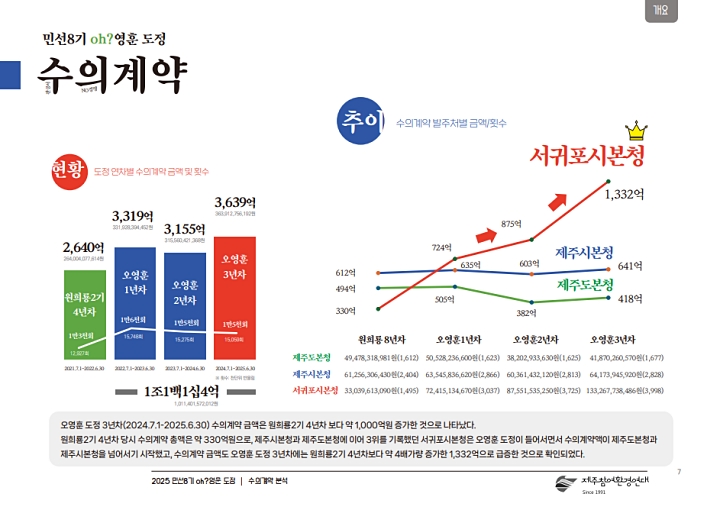 이 단체는 “원희룡 도정 2기 4년차에 서귀포시는 수의계약 총액이 330억원으로 제주시, 제주도에 이어 세 번째였다”며 “하지만 오영훈 도정 1년차에 서귀포시 수의계약 총액은 724억원으로 제주시(635억), 제주도(505억)을 앞질렀다. 오영훈도정 3년차에는 서귀포시가 1332억원으로 제주시(641억)와 제주도(418억)에 비해 압도적 차이를 보였다”고 주장했다.