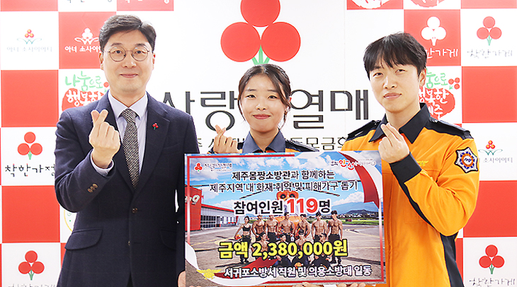 서귀포소방서(서장 고정배)는 25일 소방공무원과 의용소방대원 총 119명이 자발적으로 조성한 기부금 238만원을 제주사회복지공동모금회(회장 강지언)에 전달했다.