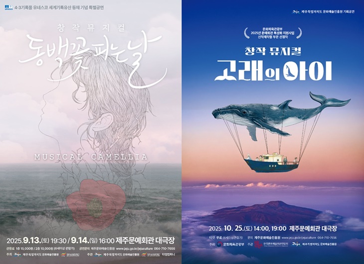 제주창작뮤지컬 '동백꽃 피는 날'과 '고래의 아이' 포스터