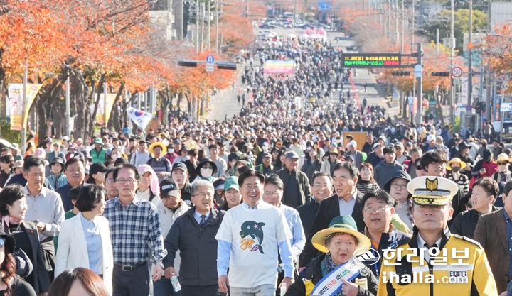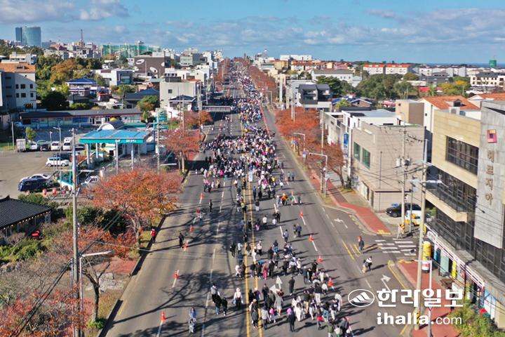 [한라일보] 화창한 날씨를 보인 30일 제주시 연삼로 일대에서 열린 '2025 제2회 차 없는 거리 걷기 행사'에서 2000여 명의 도민과 관광객들이 도로를 걸으며 가을 정취를 만끽하고 있다. 제주자치도 제공