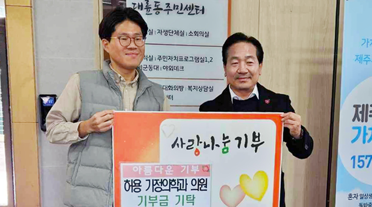 허용 가정의학과의원(원장 허용)은 지난달 26일 서귀포시 대륜동주민센터(동장 현동근)를 방문해 지역 내 어려운 이들을 위해 써달라며 기부금 300만원을 전달했다.