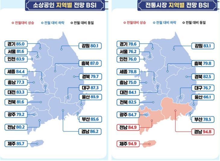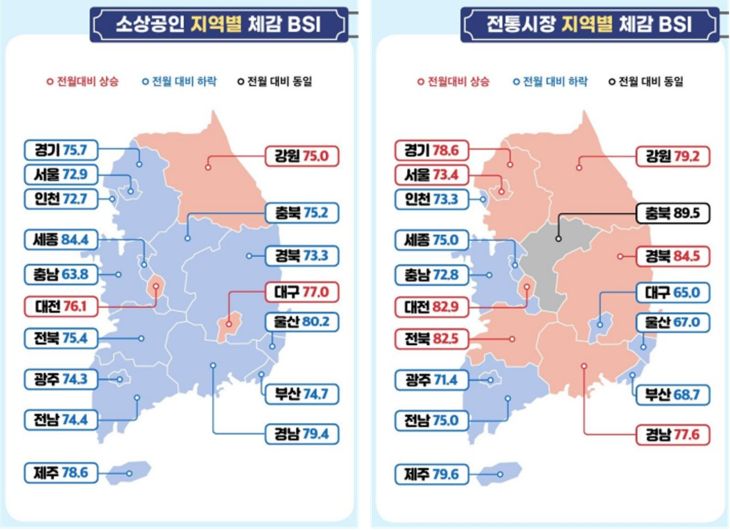 같은 기간 전통시장 체감 BSI는 79.6으로 전월(89.8)보다 10.2p 급락하며 한 달 만에 다시 하락 전환했다.