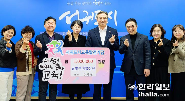 귤빛여성합창단(단장 김영진)은 지난달 28일 (재)서귀포시교육발전기금(이사장 김문수)에 발전기금 100만원을 기탁했다. 귤빛여성합창단은 지역 여성들로 구성된 아마추어 합창단으로 올해 7월 싱가포르국제합창제와 9월 탐라합창제 시상금으로 이번 기금을 마련했다.