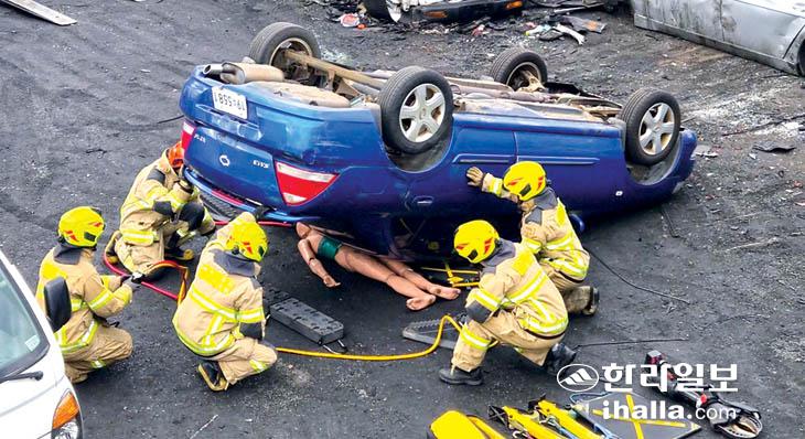 제주소방서(서장 전철하)는 지난달 28일 화북 소재 폐차장에서 다수 사상자 발생 교통사고 상황을 가정한 특별구조훈련을 진행했다.