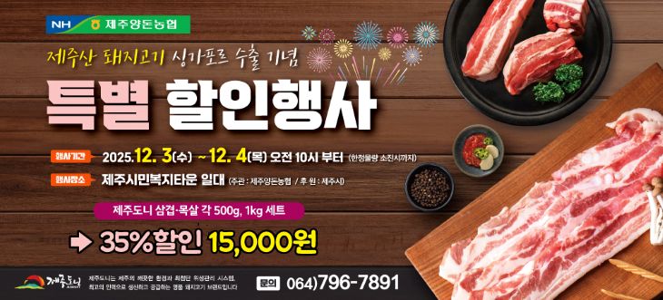 [한라일보] 제주양돈농협이 제주산 돼지고기의 싱가포르 수출 성과를 도민과 함께 나누고 소비촉진에 기여하기 위해 이달 3일부터 4일까지 이틀간 제주시민복지타운광장에서 '제주도니 돼지고기 특별 할인행사'를 개최한다.