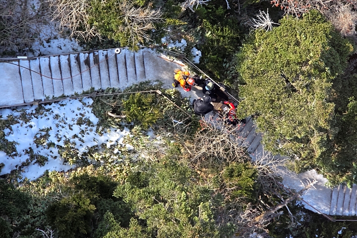 2일 오후 한라산 관음사 코스에서 50대 남성 A씨가 빙판길에서 넘어져 소방이 구조에 나섰다. 제주소방안전본부 제공