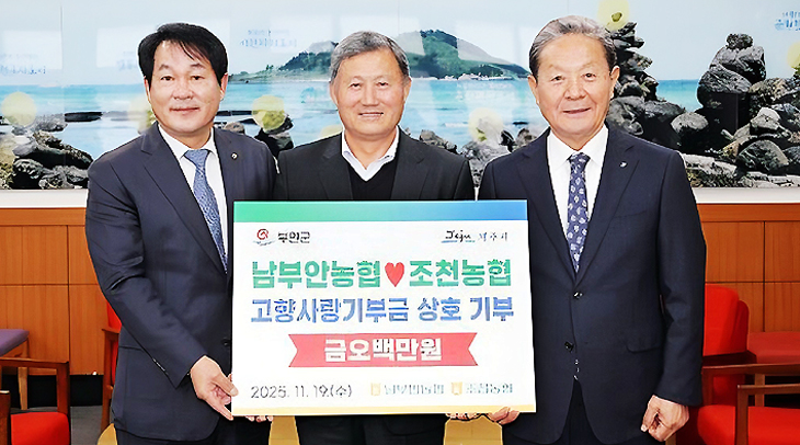 제주시 조천농협(조합장 김진문)과 전라북도 남부안농협(조합장 최우식)은 최근 고향사랑기부금 500만원을 상호 기탁하고 상생 협력강화를 약속했다.