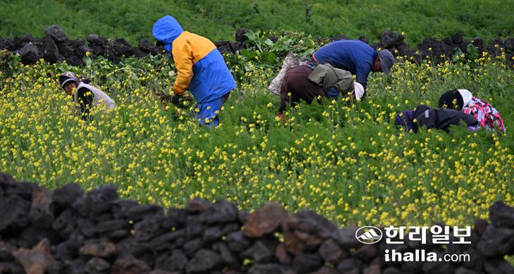 [한라일보] 강풍이 몰아친 4일 제주시 구좌읍 종달리 한 농경지에서 농민들이 김매기 작업을 하고 있다. 강희만기자