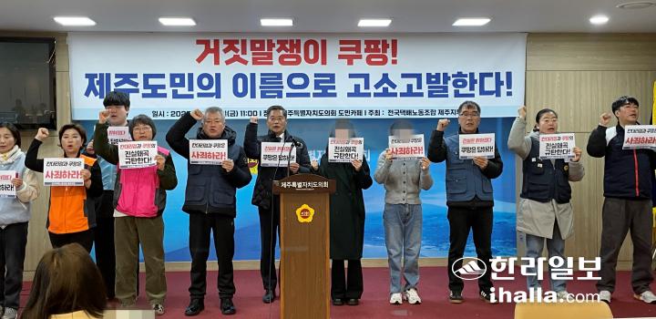 고(故) 오승용 씨의 유가족과 전국택배노동조합 제주지부는 5일 오전 제주도의회 도민카페에서 기자회견을 열고 쿠팡에 대한 고소·고발을 예고했다. 양유리기자