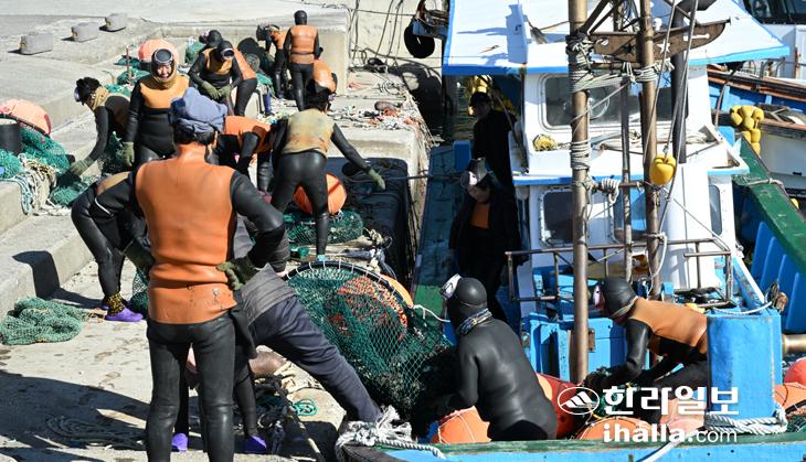 [한라일보] 9일 제주시 한경면 고산리 자구내포구에서 해녀들이 수확한 소라를 어선에서 내리고 있다. 강희만기자