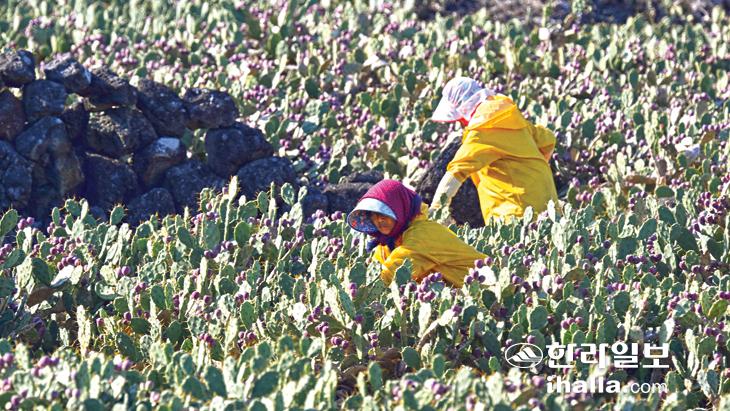 9일 손바닥선인장의 최대 군락지인 제주시 한림읍 월령리에서 농민들이 손바닥선인장 열매를 수확하고 있다. 강희만기자