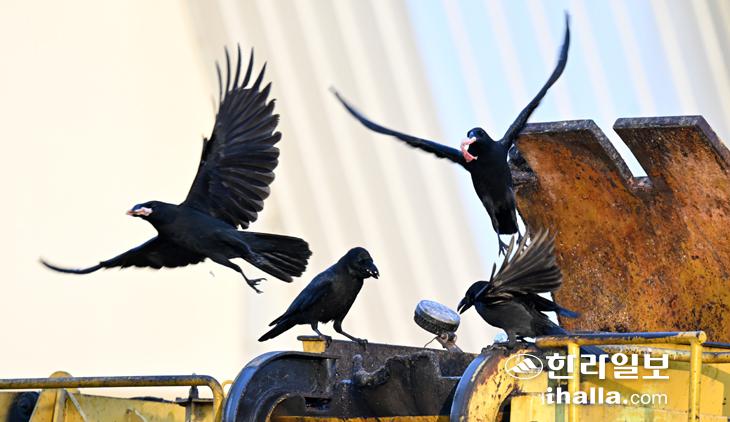 [한라일보] 10일 제주시 아라동에서 교통신호 대기중인 음식물수거 차량에 큰부리까마귀들이 날아와 음식물쓰레기를 뒤지고 있다. 강희만기자
