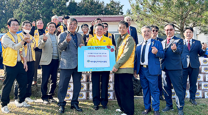 제주중앙라이온스클럽(회장 김태완)은 지난 7일 지역 내 소외된 이웃들에게 따뜻한 마음을 전하기 위해 제주시홀로사는노인지원센터에 김장김치 5kg 40박스를 전달했다.