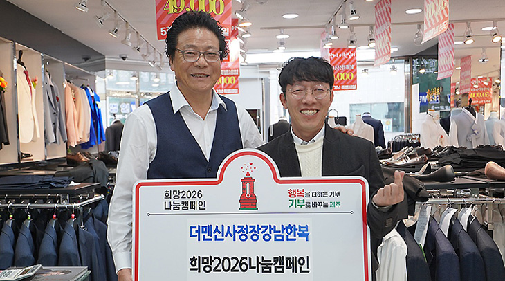 더맨신사정장강남한복(대표 김병채)은 지난 10일 연말을 맞아 어려운 이웃을 돕기 위해 와이셔츠 100벌을 제주사회복지공동모금회에 기탁하며 따뜻한 나눔을 실천했다.
