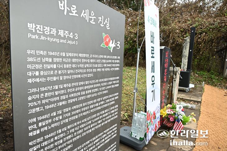 제주특별자치도와 제주4·3평화재단, 제주4·3희생자유족회는 15일 제주시 어승생 한울누리공원 인근 도로변에 제주4·3당시 강경 진압을 주도하며 도민 수천명을 무차별적으로 체포한 故 박진경 대령의 과거 행적을 정부 공식 보고서를 토대로 서술한 '바로 세운 진실' 안내판을 설치했다. 이 안내판은 박진경 대령에 대한 미화 논란을 사고 있는 추도비 옆에 세워졌다. 강희만 기자