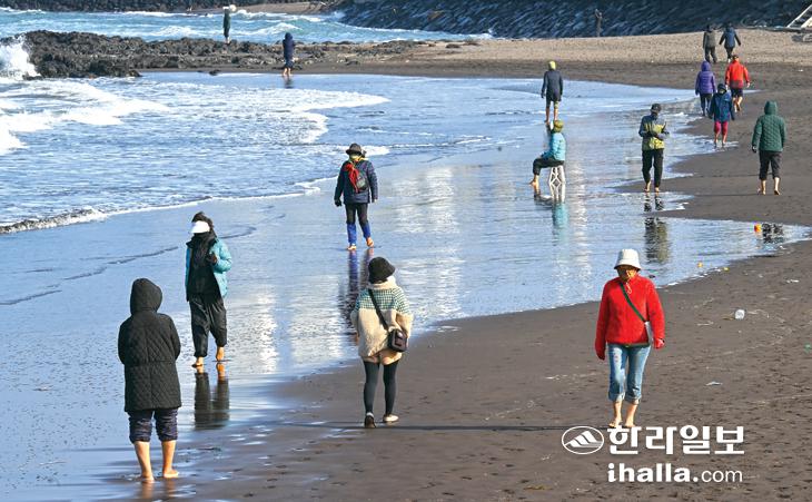 겨울 날씨에도 삼양해수욕장에서 맨발로 걷는 시민들. 한라일보DB