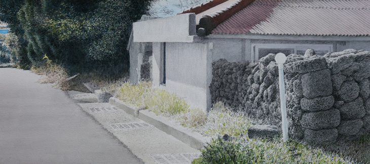 초겨울 눈부신 햇살이 마을 중심을 향하는 길에 내리쬐고 있다. 길가에 풀들은 말라있지만 가로수로 보이는 나무들은 초록의 짙은 에너지를 그대로 간직하고 있다. 오래전부터 있었던 길가의 집을 통해 최소한 두 세대의 변화가 한 화면에 들어왔다. 슬레이트 지붕은 초가집이었던 시절에 지붕 개량으로 우선 변화를 모색했을 것이다. 그래도 돌담은 큰 변화를 겪지 않았고. 마을 안길을 넓히는 작업 과정에서 집은 도로와 바짝 붙게 되었으리라. 자동차가 상용화되는 시대가 도래하면서 아스팔트길로 변모를 하고 도시기능에 가까운 배수시설까지 겸비한 길로 현대적 도로망에 편입됐다는 것은 도농복합지역 정도의 발전적 위치에 도달했다는 것이다. 그 과정에서 저 집은 낮아졌다. 도로가 높아지니 상대적으로 옛 모습은 낮아지는 순응의 모습이다. 감내해야 하는 발전의 숙명을 그리려고 한 것이다. 탈색된 붉은 지붕을 통해 시간과 빛의 만남이 성사됐다. 평범한 일상을 흠모하듯이 아무 관심도 둘 것 같지 않은 농촌마을 길가의 집을 통해 이 마을이 걸어온 길을 반추하게 되는 의미도 있다. 세상에 어떤 것도 저 눈부신 햇살 아래 그대로 있는 것은 없다. 빛보다 빠른 것을 찾지는 못하였으나 저러한 햇빛들이 변화시키는 소박한 사람들의 변천사를 발견하게 된다. 회화적인 관점에서 놀라울 정도로 다양한 명암과 그림자가 하모니를 이루고 있다. 그냥 스쳐 지나가는 무관심들을 향해 평범함이 주는 찬란한 메시지. 앞으로 이 풍경은 또한 어떻게 변해갈까?