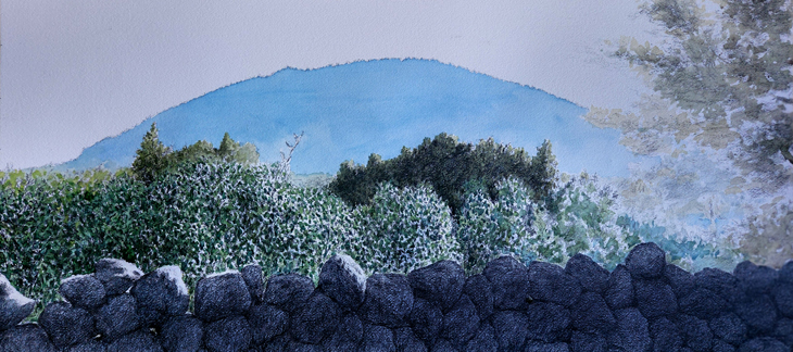 멀리 저지오름이 보이는 감귤밭. 오름의 능선은 위치를 식별하게 하는 놀라운 장치이기도 하다. 서쪽으로 해가 지려고 하는 상황. 길가와 인접한 돌담에 큰 나무의 그림자가 드리우고 감귤나무 잎들이 보유하고 있는 광택에 태양광선이 부서지니 물가의 윤슬보다 품위 있게 반짝인다. 아무 생각 없이 바라보던 감귤나무가 얼마나 부지런하게 광합성작용을 하고 있는지 새삼 느끼게 돼 그린 것이다. 그냥 편안함을 주는 구도 속에서 시간성이 부여하는 빛의 논리를 그리는 행위는 월림리가 보유하고 있는 감귤마을의 자긍심과도 맞닿아 있다. 평범한 모습 속에서 아름다움을 찾는 작업이기에 그림으로 등장해 달라지는 존재감 또한 의미가 있다. 오른쪽 큰 나무는 이미 낙엽이 떨어질 정도로 누렇게 변했지만 감귤나무는 상록이다. 묘한 대비효과를 그 햇살과 버무려서 시간성을 담당하게 했다. 겨울이 오면 변하는 것과 변하지 않는 것이 극명하게 대비된다. 그렇다 하더라도 빛을 반사하는 본질적 물상의 의무는 유지된다. 돌담에 부딪혀서 반사된 빛이나 감귤나뭇잎에 부닥쳐서 반사된 빛이나 빛을 대하는 태도는 동일하다. 문제는 감귤나무의 숱한 잎들이 그 윤이 나는 잎사귀에서 반사하는 빛들은 그 자체로 신비로움이 깃들어 있다. 감귤향을 사랑하는 사람들의 마을에서 감귤나무가 보유한 빛의 성찬을 그리려 하는 것이다. 산과 나무와 돌. 아주 단순한 만남이 그대로 유지되는 것은 자연이 살아 숨 쉬고 있다는 것이다. 삶의 터전이기에 더욱 아름다운 것이다.