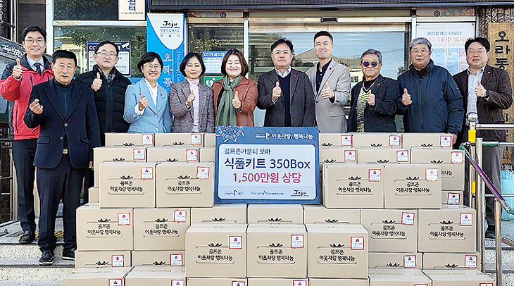 골프존카운티 오라(대표 서상현)와 골프존문화재단(대표 김영찬)은 지난 18일 제주시 오라동주민센터에서 지역 내 어려운 이웃을 위한 식료품 키트 350세트(1500만원 상당)를 전달했다.