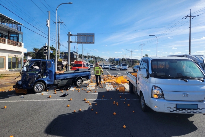서귀포 도로서 트럭 2대 부딪혀… 감귤 쏟아져 …