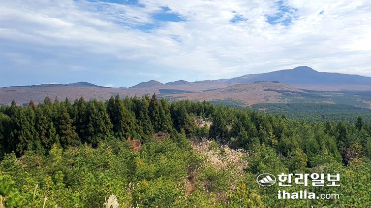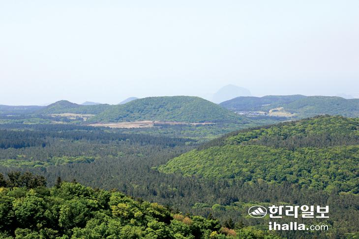 정면에 보이는 오름이 돌오름, 왼쪽에 능선처럼 완만하게 보이는 부분이 한대오름. 사진 김찬수