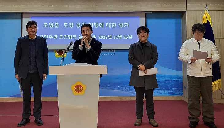 [한라일보] 더불어민주당 당원모임인 ‘국민주권 도민행복 실천본부’는 26일 제주도의회 도민카페에서 기자회견을 열어 오영훈 제주도지사의 공약 이행 실적이 실제와 다르다고 주장했다.