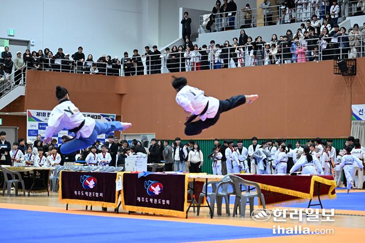 '태권신동' 변재영과 YJY선수단 이지효가 29일 제주복합체육관에서 열린 제1회 한라일보배 전도 태권도 품새대회에서 식전공연에서 자유품새 연기를 선보이고 있다. 강희만 기자