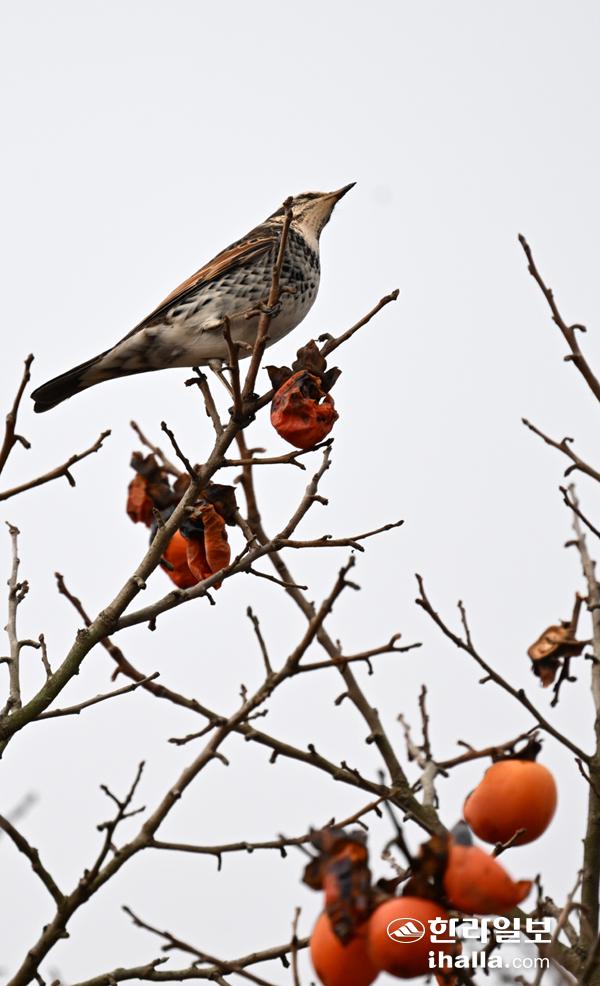 [한라일보] 28일 서귀포시 표선면 성읍민속마을을 찾은 개똥지빠귀 한마리가 잘 익은 홍시를 먹기 위해 감나무 가지에 앉아 있다. 강희만기자