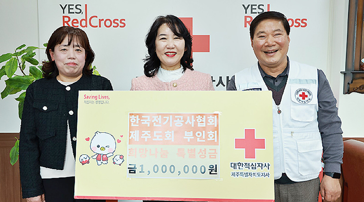 한국전기공사협회 제주도회부인회(회장 김은희)는 대한적십자사제주특별자치도지사(회장 정태근)에 희망나눔 특별성금 100만원을 전달했다.