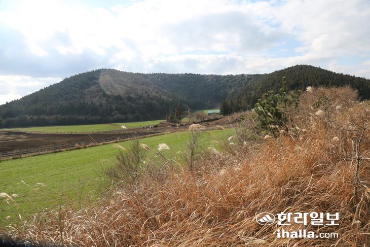 부대오름. 불룩하지만 위는 평평하며, 넓게 벌어진 오름이다. 사진 김찬수