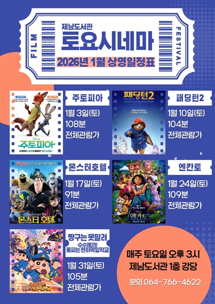 [한라일보] 제남도서관은 내년 1월 3일부터 12월 26일까지 영화 상영 프로그램 '토요시네마'를 운영한다.