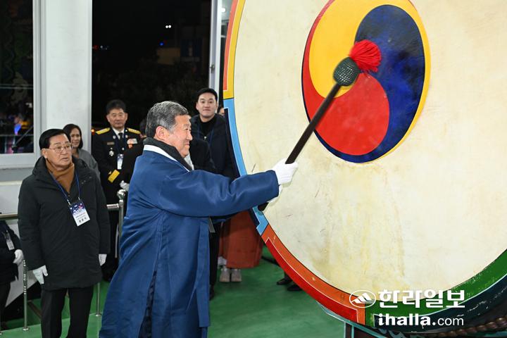 김완근 제주시장이 시민들의 염원을 담은 신년 메시지 낭독과 제주도립합창단 공연, 새해맞이 카운트다운에 이어 각계각층의 시민 대표 33인과 함께 북을 치고 있다.